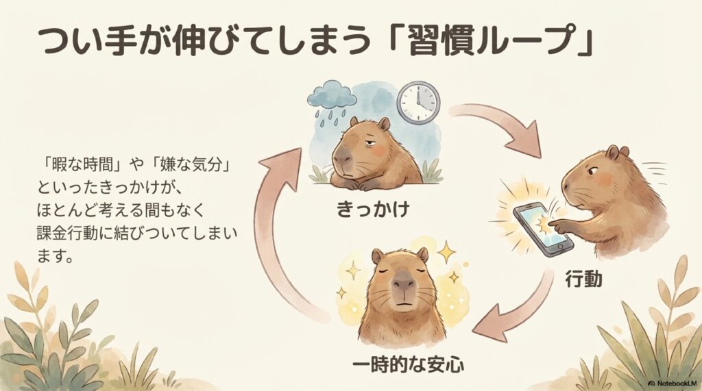 こうしたきっかけが、過去の課金体験と結びつき、ほとんど考える間もなく行動が起きてしまいます。