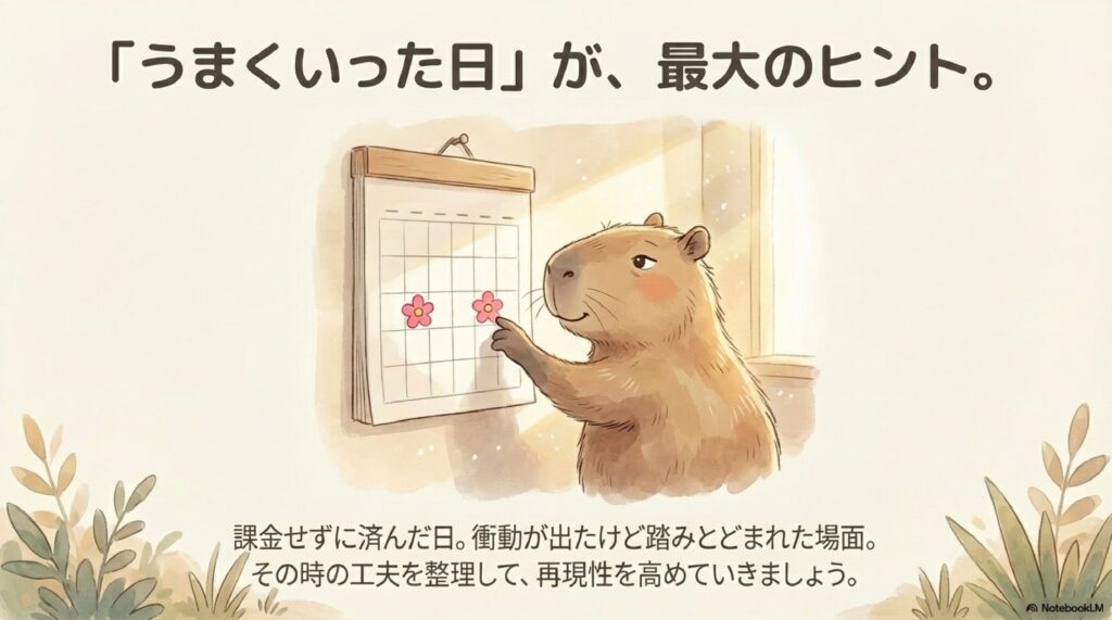 課金せずに済んだ日や、衝動が出たけれど踏みとどまれた場面に注目します。