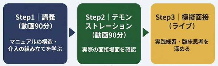 あわせて、デモンストレーションを通して実際の面接の運びや技法の導入場面を具体的に確認し、理論と実践の橋渡しを行います。